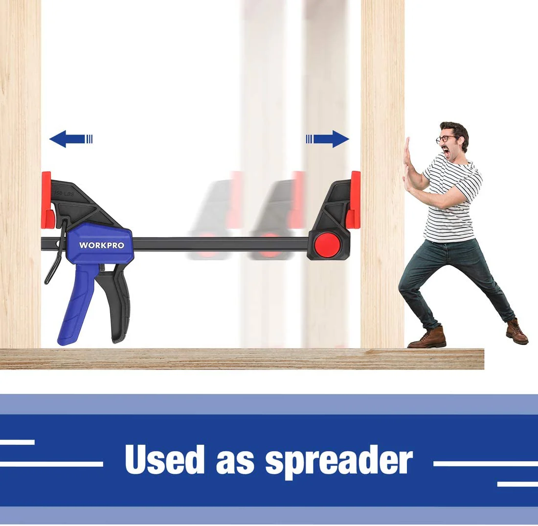 The unique quick-change button design allows the f clamp to be a spreader as well. Just press the red button to take the jaw off and then reverse it before putting it back in, you will get the spreader you need.
