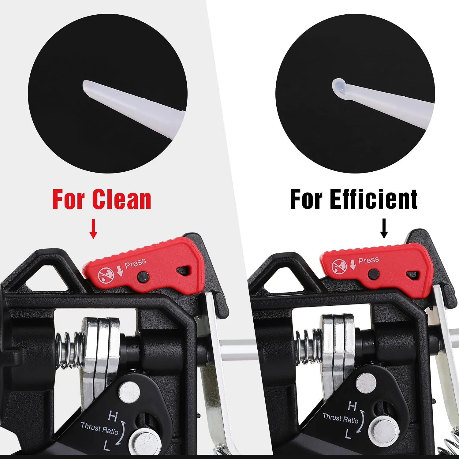 Drip-free caulk gun with a smooth circle rod makes for a much cleaner and easier job.