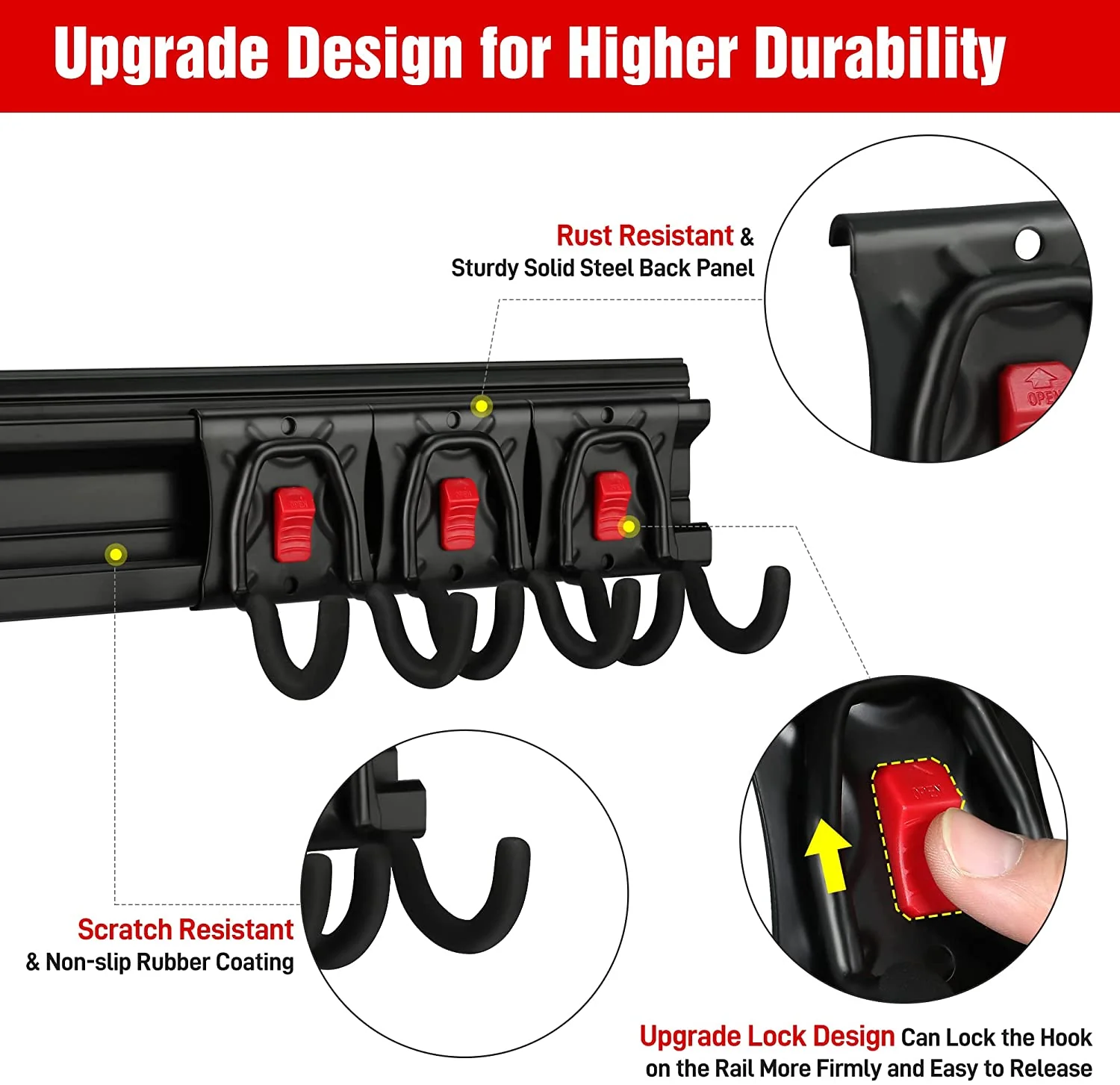 The hooks can snap on the rail easily and move around on it to meet your different needs. Upgrade lock design can lock the hook on the rail more firmly and easy to release. Can be installed on drywall, wall studs, or masonry. Up to 64-inch storage, length can help save your storage space to a greater extent.